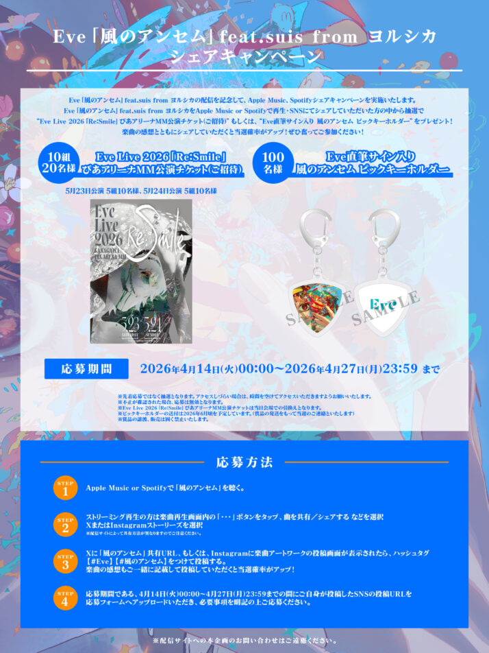 新曲「風のアンセム」feat. suis from ヨルシカのリリースを記念して、サブスクシェアキャンペーンの開催が決定いたしました。